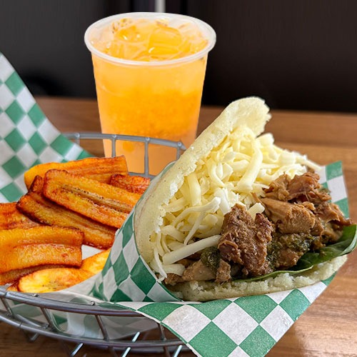 Any Arepa of your choice, sweet plantains on the side and Passion Fruit or Papelón.