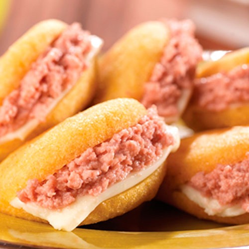 Fried arepa with deviled Ham & Cheese.