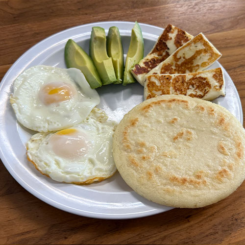 Two Eggs, Avocado, Fried Cheese and Arepa.