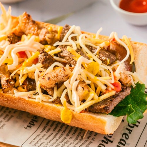 Pepito sandwich made with juicy grilled beef, cheese, caramelized onions, peppers, mushrooms, and fresh lettuce.