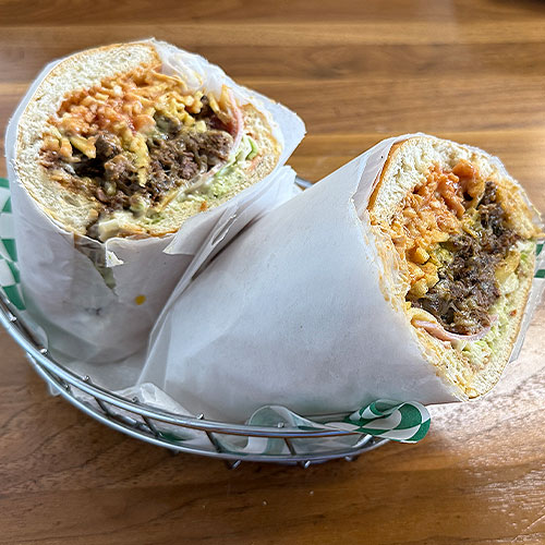 Pepito sandwich made with beef & ham, cheese, caramelized onions, peppers, mushrooms, and fresh lettuce.